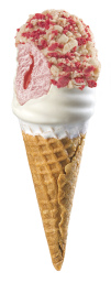 Strawberry frozen dairy dessert with a swirl of strawberry dipped in whipped cream flavored coating topped with cake pieces all inside a shortbread cone.