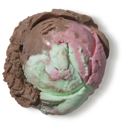Chocolate ice cream, old-world nut ice cream and spumoni ice cream with fruit mix and mixed nuts.